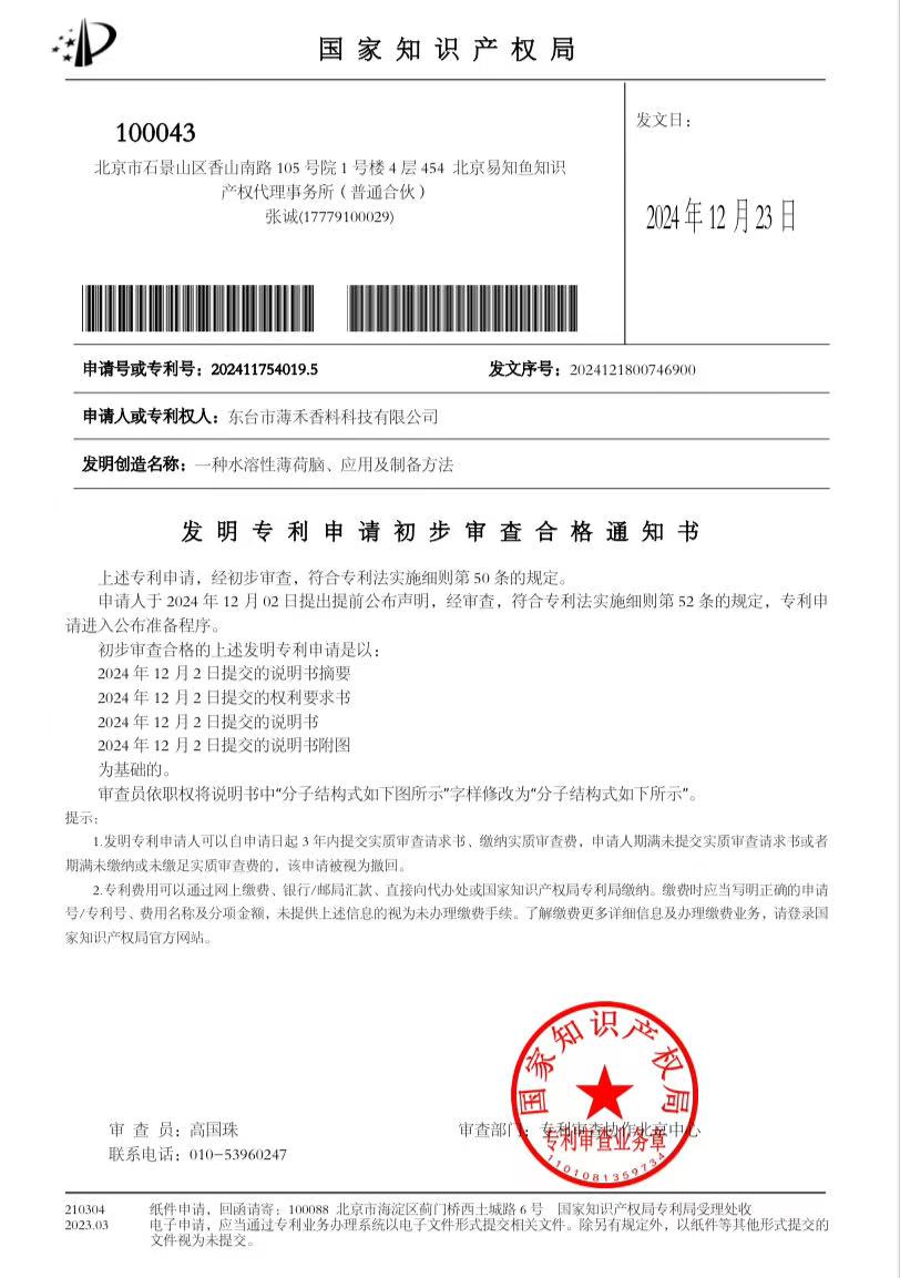 公司科研创新取得重大突破 网站首页 > 公司概况 > 公司科研创新取得重大突破 东台市薄禾香料科技有限公司 科研创新取得重大突破 本公司2023年下半年立项的水溶性薄荷脑中试投产项目今年试运行成功,特别是食用水溶性薄荷脑配方取得重大突破。已于2024年九月初向国家知识产权局提出发明专利申请,并于2024年12月23日获得国家知识产权局初审合格,进入公布准备程序。
