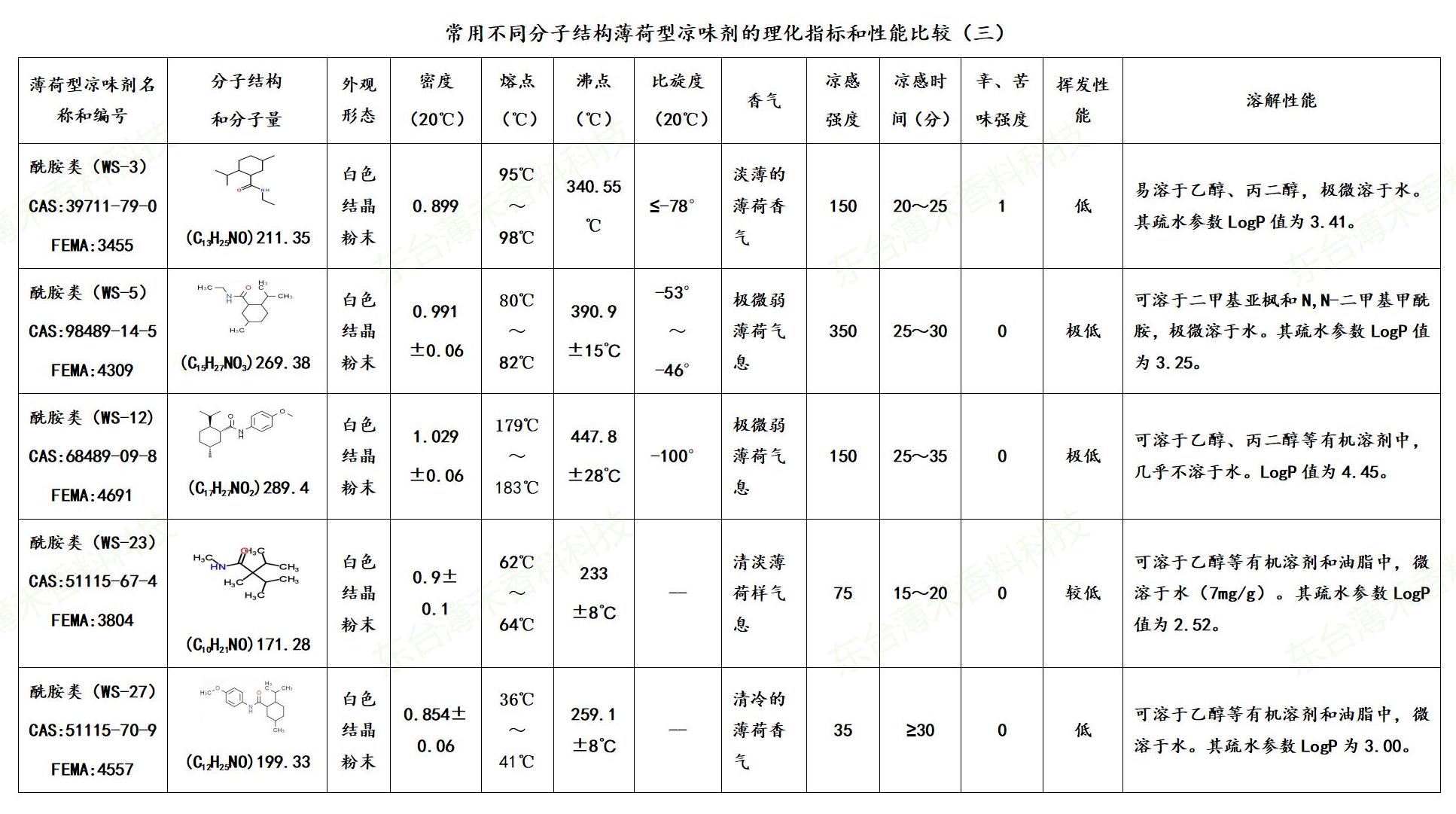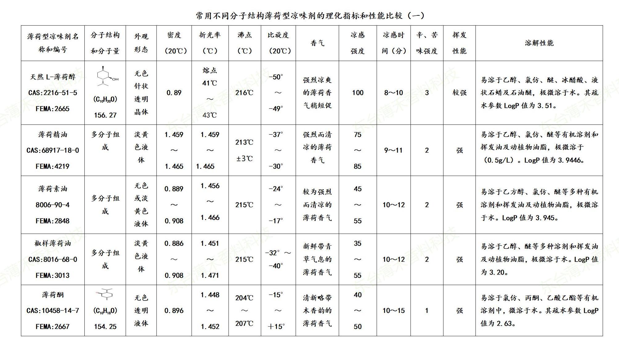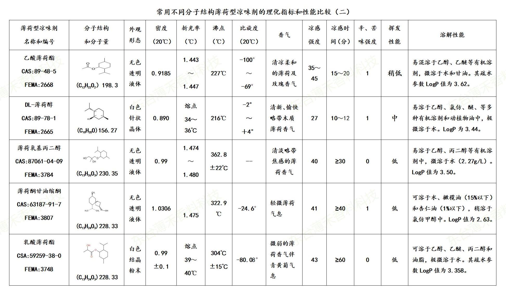 ⑤ 溶解性:几乎所有的薄荷型凉味剂都是亲油而疏水的。但由于它们分子结构的差异而使得它们的溶解性能和疏水指数不尽相同。具体的疏水指数LogP值和部分水溶性数值详见附表(1~3)。
